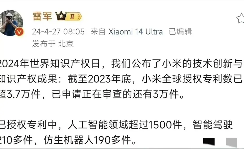 各位科技圈的吃货们,昨天可是个大日子——世界知识产权日!小米公司可没闲着,雷总亲自操刀,给咱们来了一场知识产权的盛宴!李军小哥也不甘示弱,一篇文章就把小米的专利数亮了个底朝天,哎呦,这操作真是亮瞎了我的钛合金眼!