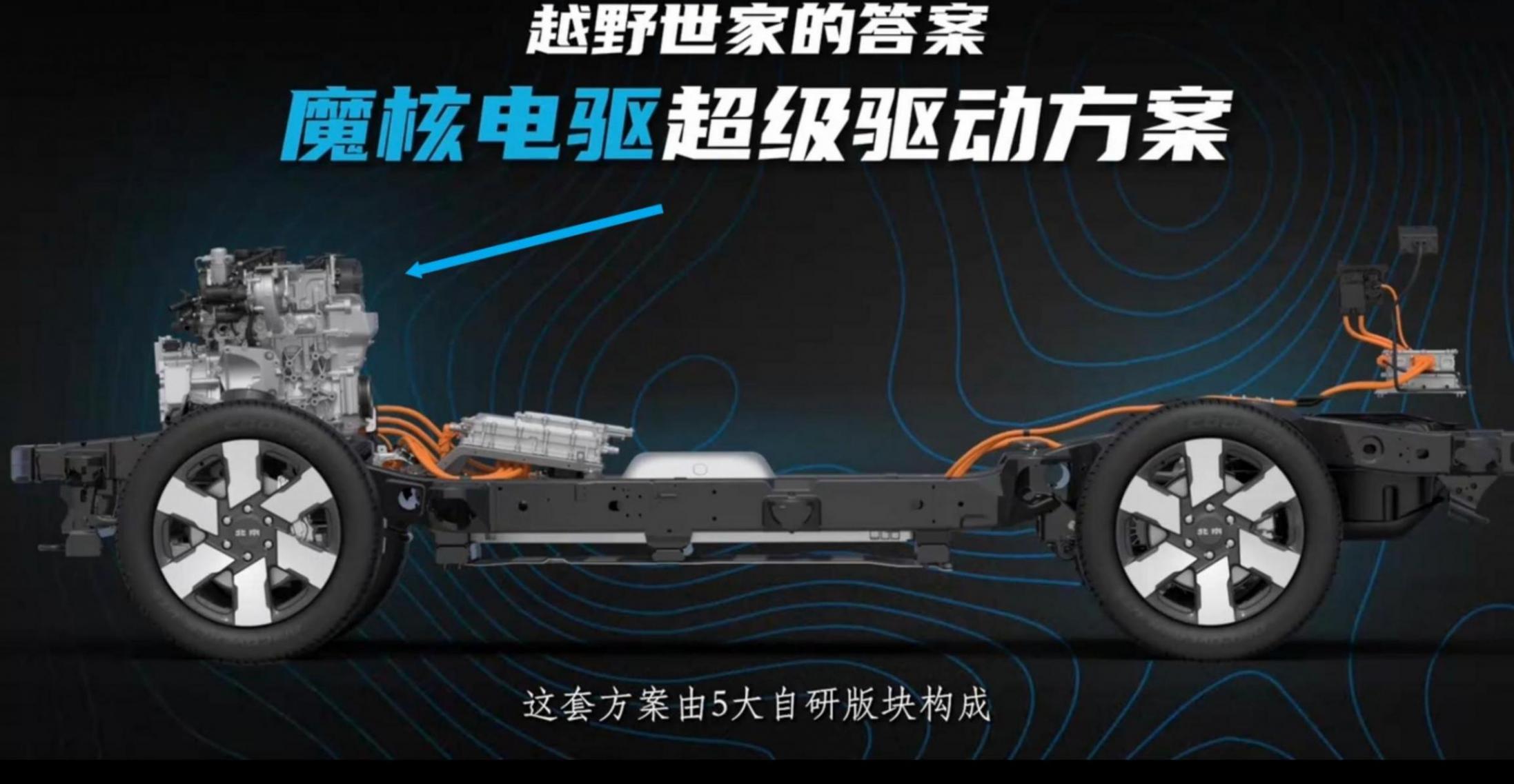 魔核电驱在承载式suv上的应用,就是bj30e,采用的是dht混动,发动机即可以直驱,也可以前部电机电驱,后桥采用p4电驱桥,实现电四驱。电池采用小容量大功率,不插电的混动,即hev。