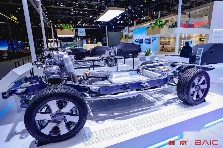 bj60e、bj40e,非承载,带大梁,采用了增程技术路线,前后桥分别是电驱桥,中部没有机械传动分动器,布局了40度大容量电池,前部发动机舱布置1.5t增程器。