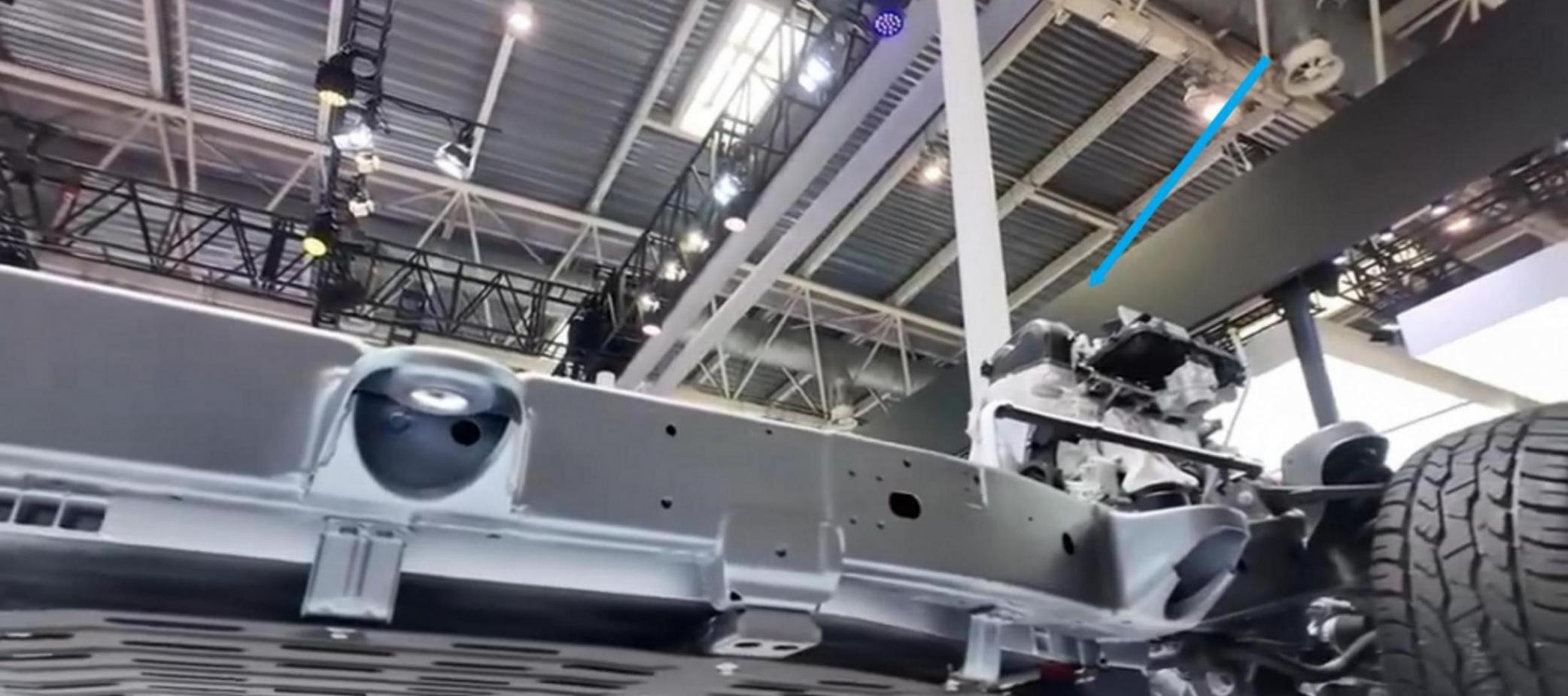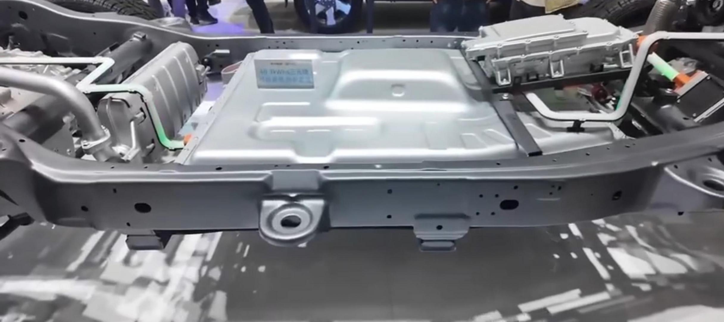 另一个特点,大容量电池位于大梁之间,如图所示,三元锂电池包,通过几个柔性悬置,正好布局于两纵梁之间,既能保护电池,又不占据离地间隙,柔性连接,车架的扭转变形不影响电池包。电池包除了本身防护,大梁的保护,还有底板加装了防护板,多重保护。