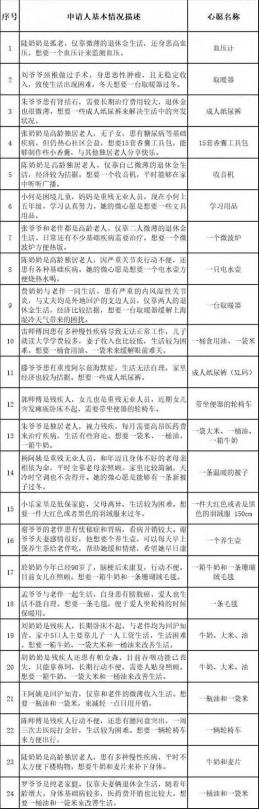 部分“微心愿”清单