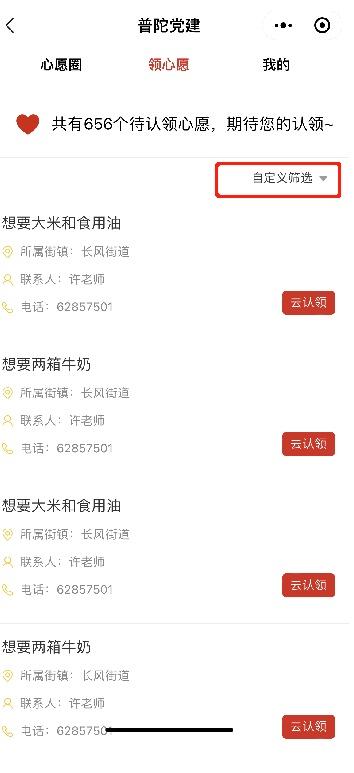 然后,点击进入“认领心愿”板块,点击“自定义筛选”。