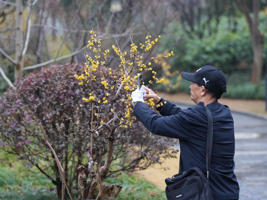 而市民郑大姐则更加迷恋雨后蜡梅淡雅的香气,她笑着说,蜡梅的幽香不像工业香水那般很冲鼻,是自然天成的“礼物”,“闻了雨后蜡梅的香气,我感觉十分幸福,这花蕊上的雨滴,就像我们幸福的泪珠往下滴。”