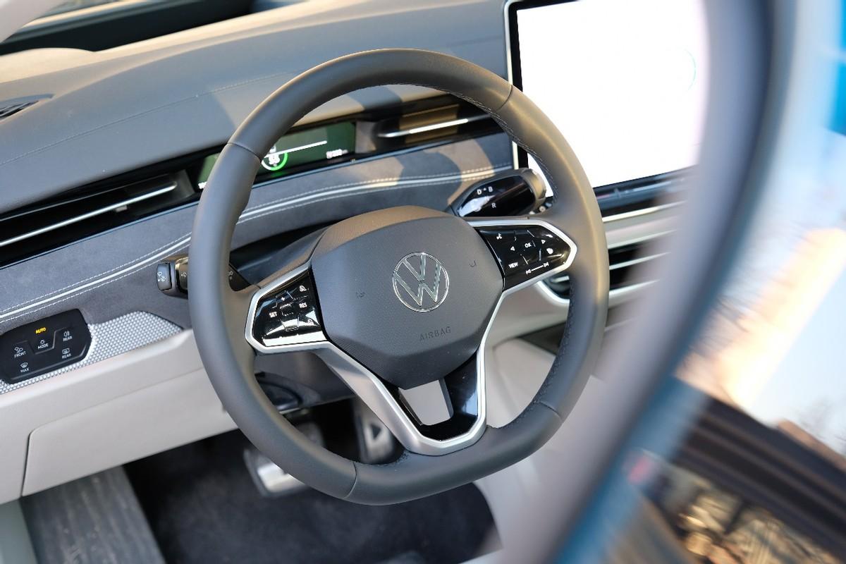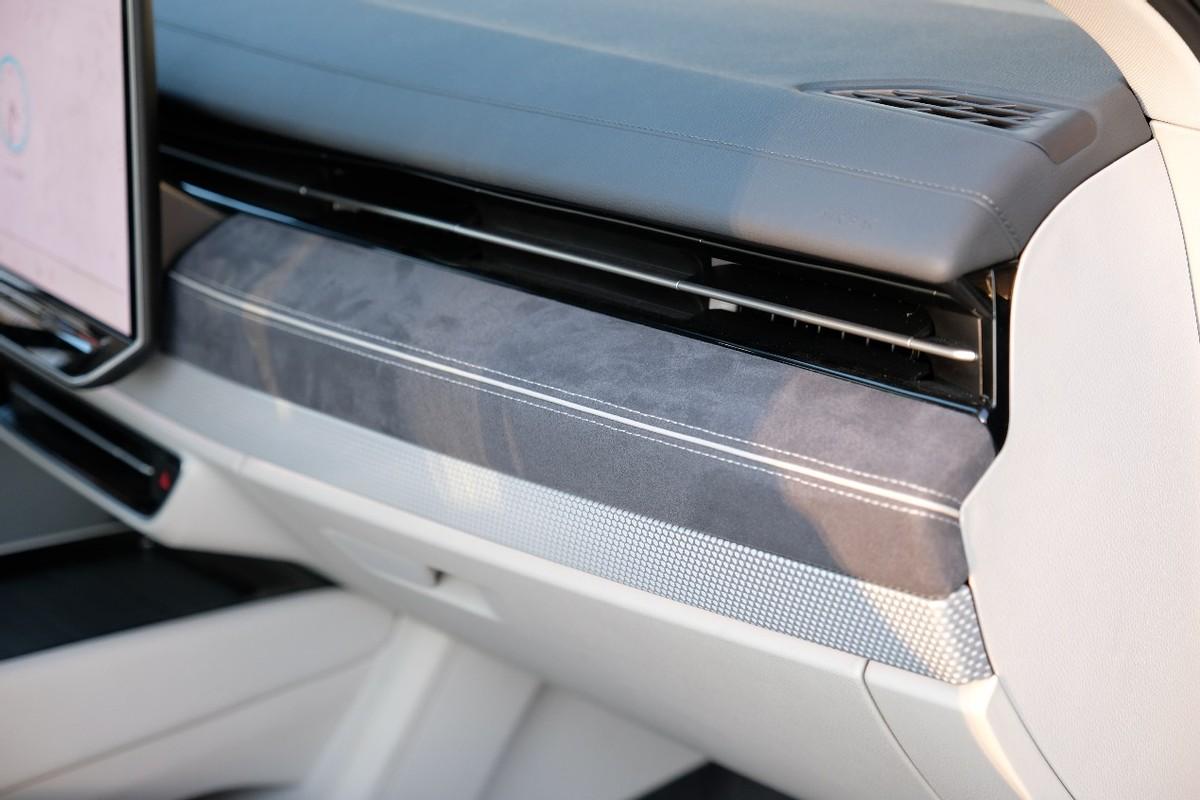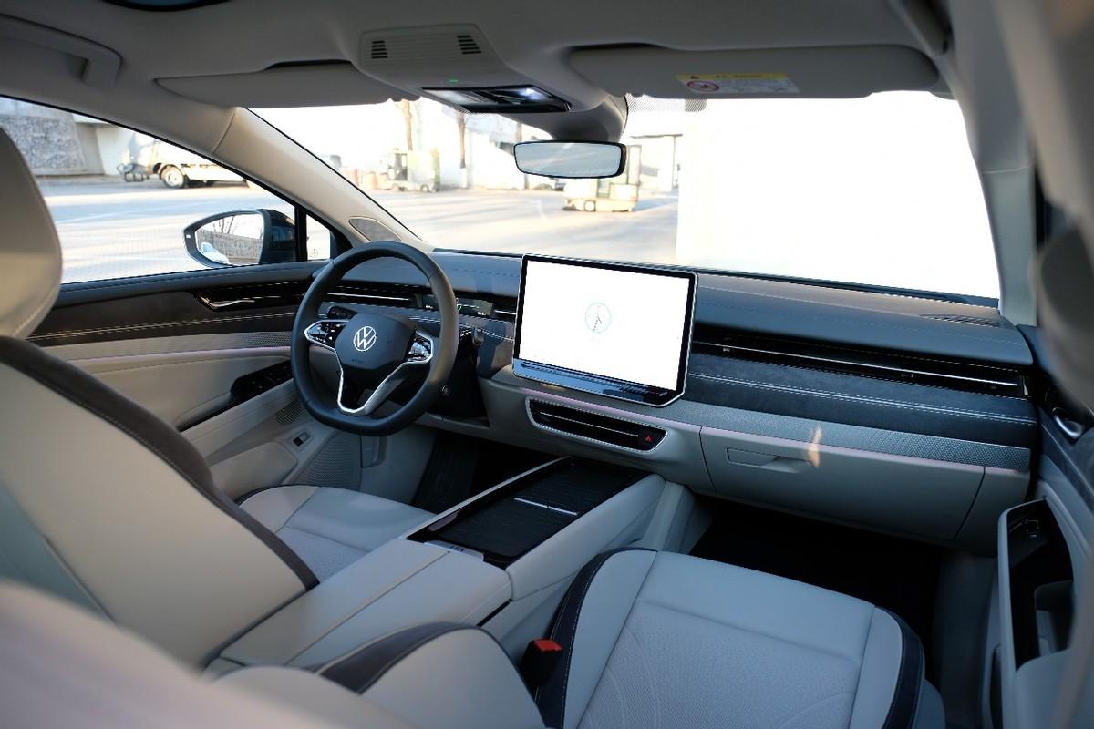 第一眼见到id.7 vizzion的内饰,它会营造出一种极其简约、干净的印象,中控区域没有任何实体操作按键,全部集成在了中间那块大屏幕上。内饰的整体做工精致、细腻,日常接触的区域全部用上了软质材料进行覆盖,门板和副驾驶台区域还用上了翻毛皮材质进行点缀,营造一丝运动氛围。