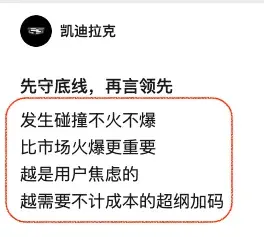 而在正文的部分,凯迪拉克给出的表态,真像是在「隔空评论」问界m7碰撞起火这件事,他们说比起市场销量的火爆,更重要的还是「发生碰撞不火不爆」,同时还指出「越是用户焦虑的,越需要不计成本的超纲加码」。