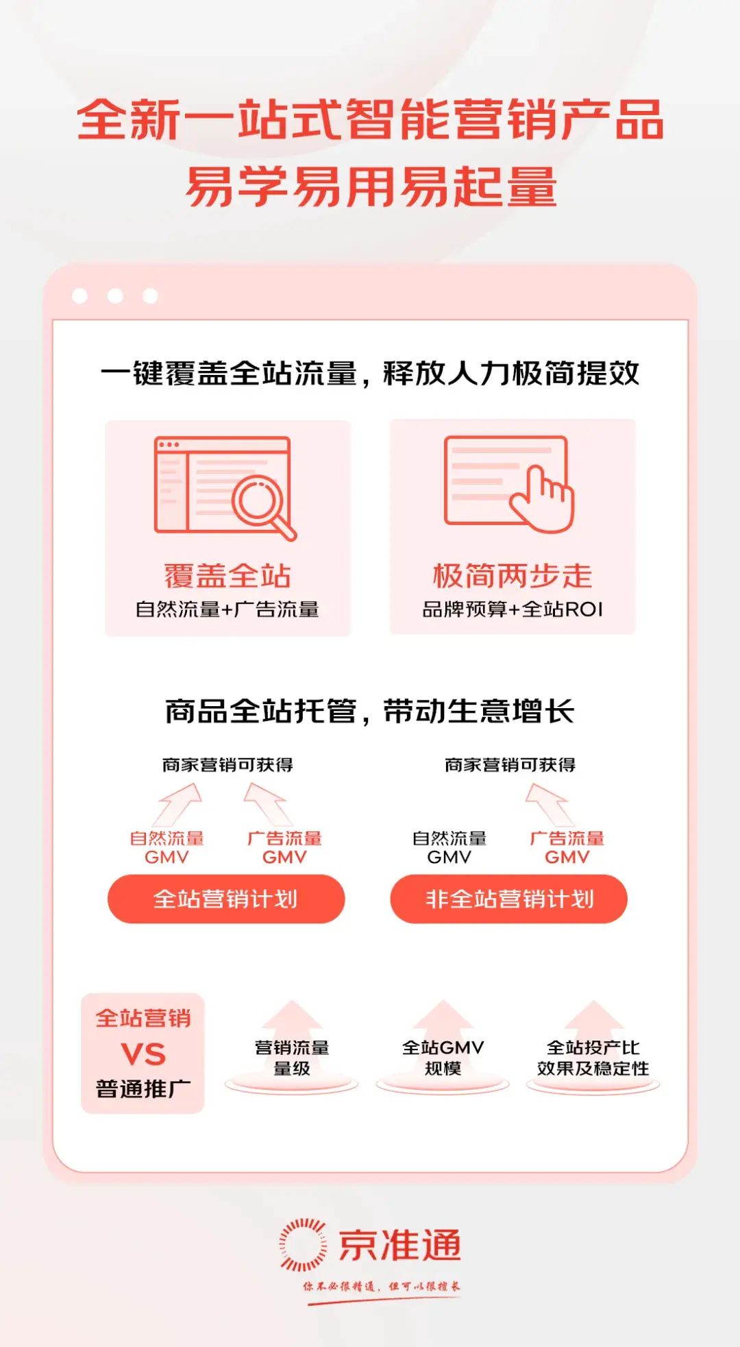 当然,最能体现agi时代营销的“智”与“简”的,莫过于京准通4月15日推出的重磅产品——全站营销,你只需要选择目标商品,输入全站的roi目标,然后剩下来的事情它都能自己完成。