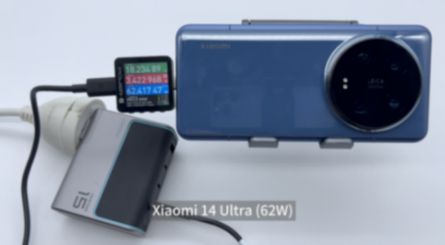 为小米14 ultra 充电,使用 power-z km003c 测试仪读取到的功率为18.23v 3.42a 62.42w。