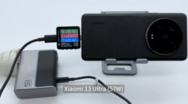 为小米13 ultra 充电,使用 power-z km003c 测试仪读取到的功率为18.27v 3.14a 57.44w。