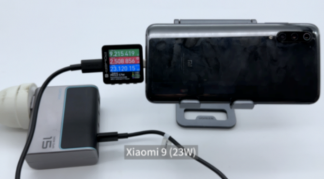 为小米9充电,使用 power-z km003c 测试仪读取到的功率为9.22v 2.51a 23.12w。