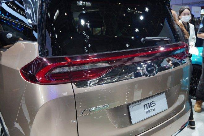 车辆侧面就是一个标准的mpv造型设计,车辆的后车顶部分并没有像下压,营造出运动造型,而是中规中矩的使用了较平坦的车顶来保证乘员,尤其是第三排乘员的头部空间。d柱采用了半悬浮设计,窗线饰条使用了亮色镀铬,和整车的调性形成统一。 就像前面说的那样,广汽传祺m6 max的体型看上去并不大,整车长宽高分别为4793/1837/1730(mm),轴距为2810mm,与m6 pro基本保持了一致。车侧的腰线依旧是一条笔直较为硬朗的线条,审美还是很在线的。轮毂使用了多辐条设计,实拍的展车搭配了佳通品牌轮胎