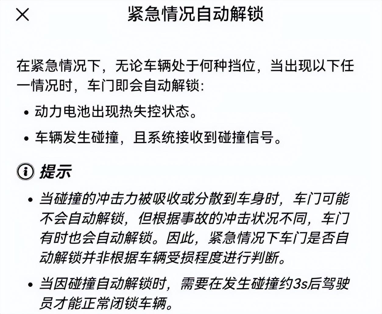 经过查询,“自动解锁”功能,是有责任心的企业基本的共识,10万以下的车,很多都有此功能。蔚来、理想等新能源车企,均明确表示,旗下所有车型在事故后车门均有自动解锁功能。