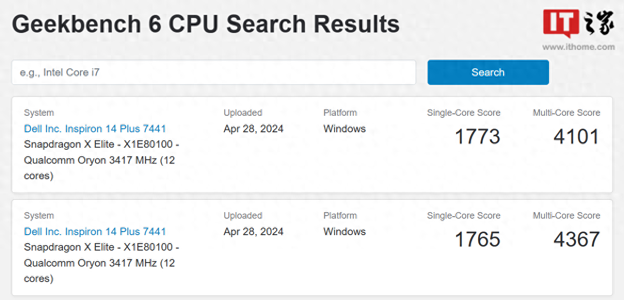 4 月 29 日消息,戴尔灵越 inspiron 14 plus 7441 笔记本首度现身 geekbench 数据库,搭载高通骁龙 x elite x1e-80-100 处理器。