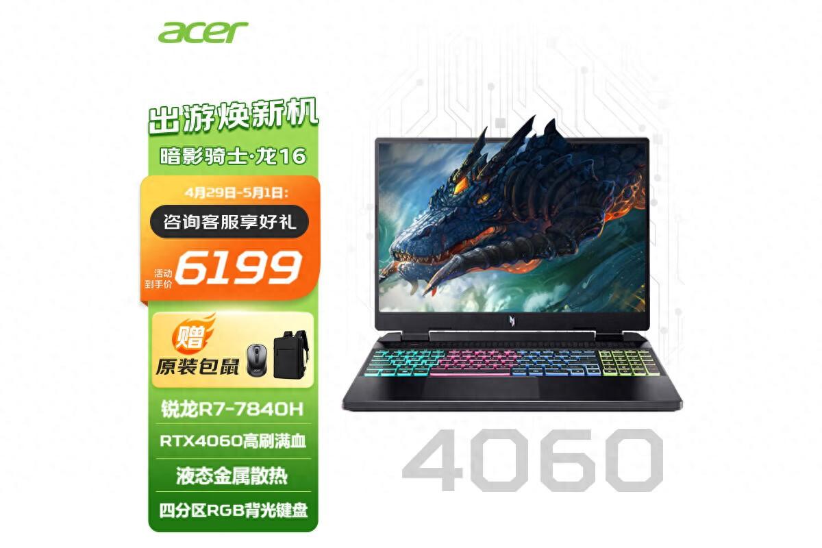 宏碁 2024款暗影骑士·龙,ryzen 7 7840h rtx 4060 16gb 512gb ssd,首发价6999元,到手价6199元,京东地址:点此前往>>>