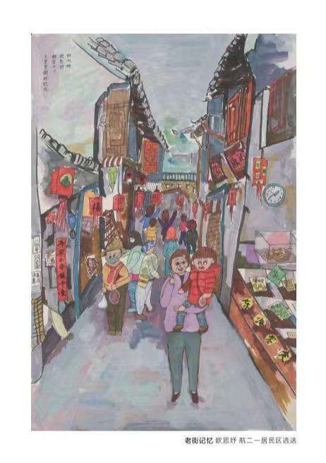 荣获绘画作品少儿组一等奖的欧思妤,是航华第二小学的学生。她创作的《老街记忆》,描绘了七宝老街的景象。“七宝是我从小长大的地方,老街蕴藏着我最美好的回忆,所以我选择用绘画来记录这份美好。”欧思妤说。