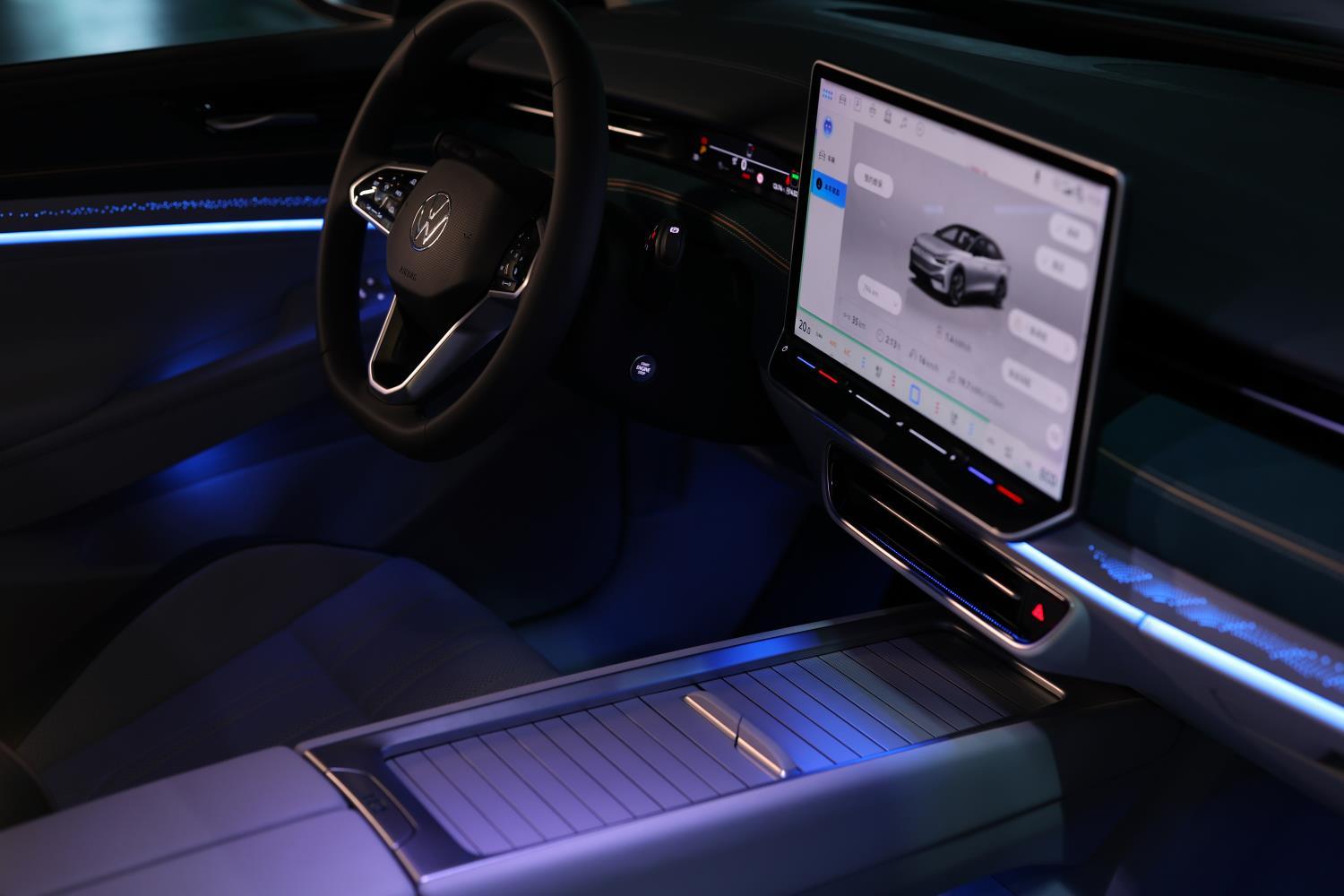 相比新势力的冰箱彩电大沙发,id.7 vizzion更加注重车机交互和氛围上的营造,除了车内本身的30色氛围灯、14扬声器哈曼卡顿音响系统、负离子空气净化器所提供的视觉、听觉、嗅觉上的沉浸式体验外,在前风挡下面还有一条与你实时互动的彩色灯带,你在车内的一切活动,它都会给予你反馈,让你仿佛与一个智能生命体共处一车。