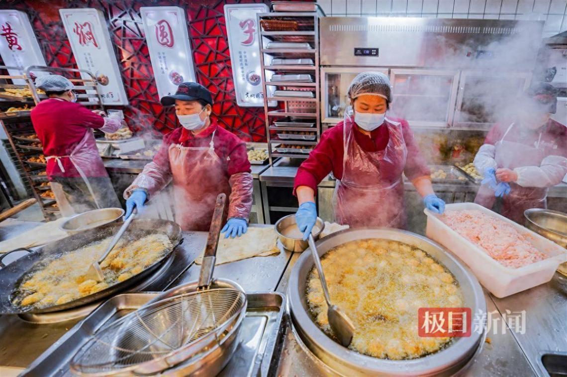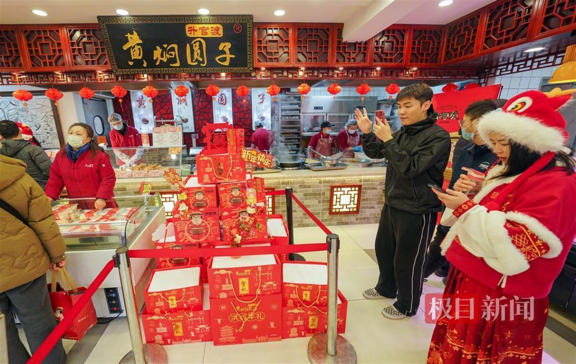 升官渡黄焖圆子是可以吃的非遗美食,鲜香弹牙,是许多武汉人喜欢的过年味道。年货节的现场弥漫着炸圆子的香味,滋滋作响的油锅旁边,是站着长队等待购买的市民。