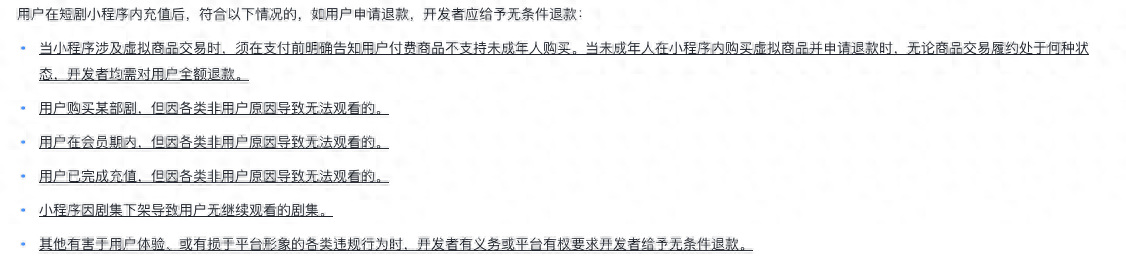 (3)针对用户在短剧小程序内充值后,符合以下情况的,如用户申请退款,开发者应给予无条件退款: