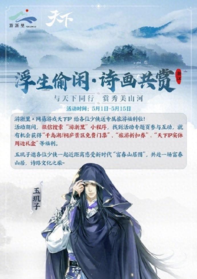 不妨跟着“游浙里” 来一场新时代的富春山居,诗路文化之旅!游浙里携手网易游戏天下ip,邀少侠们一同走进传世名画,在山水秀色中品江南雅韵。即日起,在游戏内扫描“游浙里”二维码或微信搜索“游浙里”小程序,前往活动专题页参与互动就有机会获得“千岛湖/桐庐景区免费门票”、“旅游折扣券”、“天下ip实体周边礼盒”等惊喜福利。