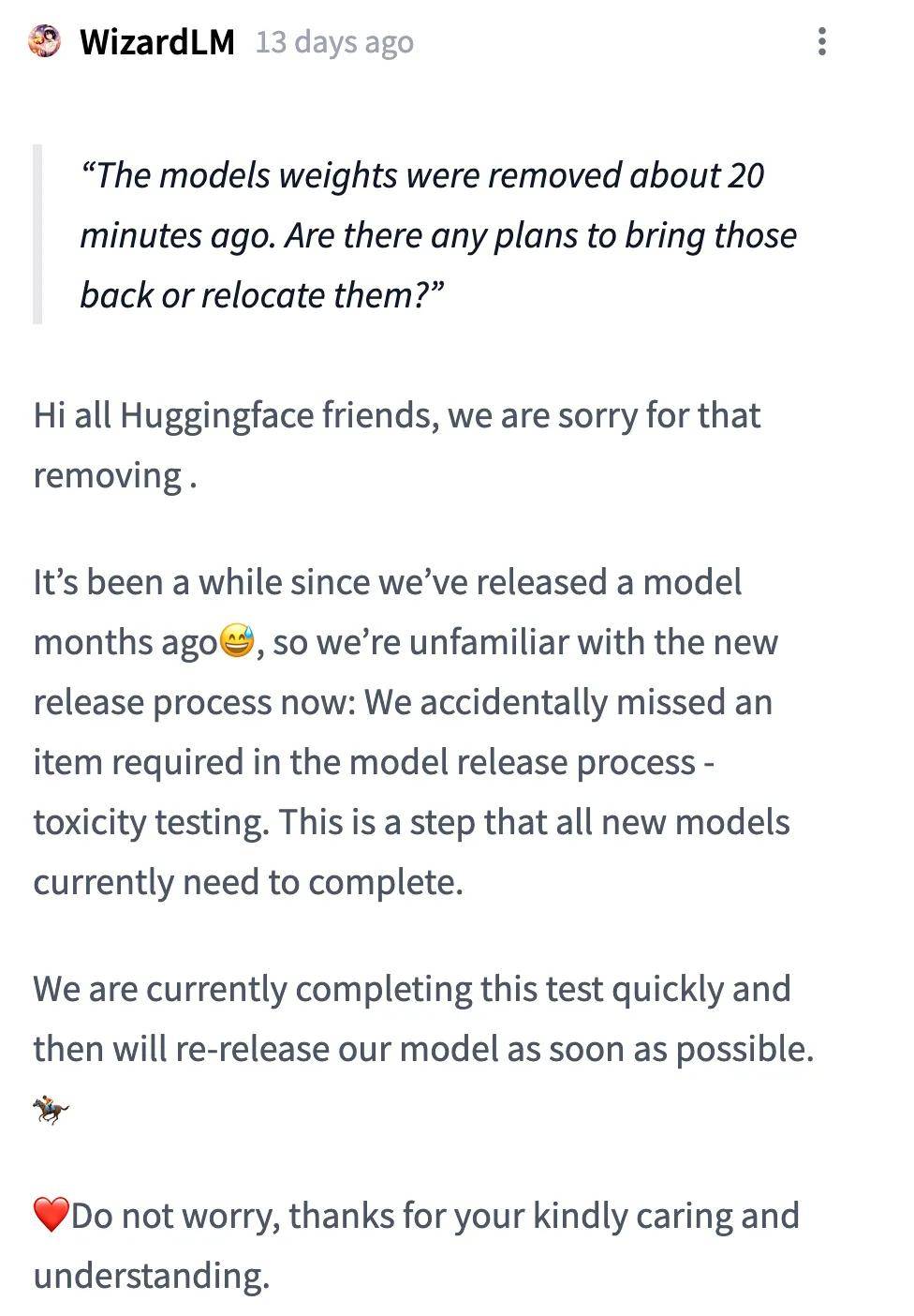 所有 huggingface 的朋友们,大家好!很抱歉,我们删除了模型。我们已经有一段时间没有发布几个月前的模型了,所以我们现在不熟悉新的发布流程:我们不小心遗漏了模型发布流程中的一个必要项目 — 毒性测试。这是目前所有新模型都需要完成的一个步骤。