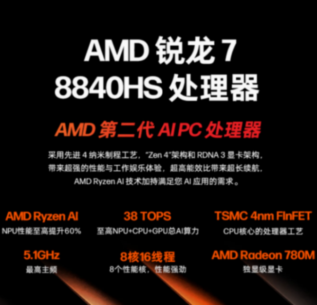这一次发布的战 x 锐龙版搭载的是 amd r7 8840hs 处理器,拥有 8 核心 16 线程,最高主频可以达到 5.1ghz,另外还继承了 radeon 780m 显卡,综合性能表现出色的同时,还能将功耗控制在一个比较不错的水平。