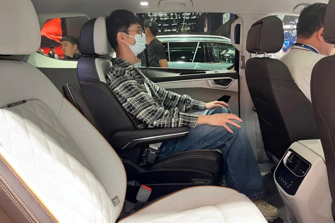 咱们直接从第二排开始体验,仅通过图片大家就能很直观的感受到空间的出色,前排座椅正常的状态下,第二排腿部空间近乎可以蹲下一个成年人,拿数据来说,揽境二排净值空间达到了1775mm,远超同级别竞品,甚至已经比多数mpv车型更为出色了。