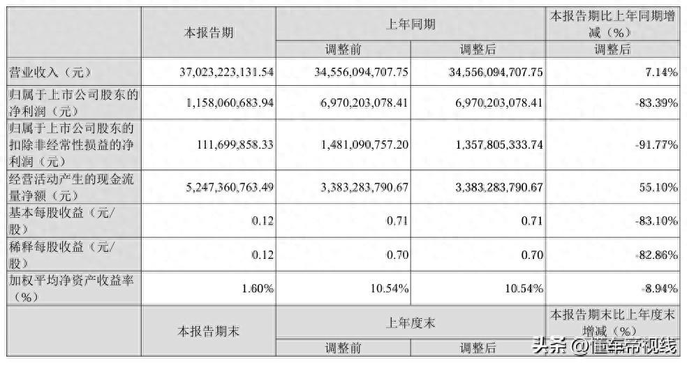 行业] 日前,长安汽车公布了第一季度财报。数据显示,2024年一季度,长安汽车营收370.23亿元,同比增长7.14%。不过归母净利润只有11.58亿元,同比下降83.39%。扣除非经常性损益后,净利润更是减少至1.12亿元,同比降91.77%。