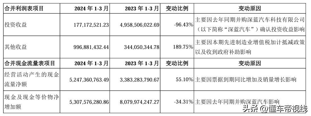 至于净利润的暴跌,则是因为去年同期并购深蓝汽车确认投资收益影响。据了解,2023年一季度,长安汽车通过增加深蓝汽车的持股,所得收益达50.21亿元。