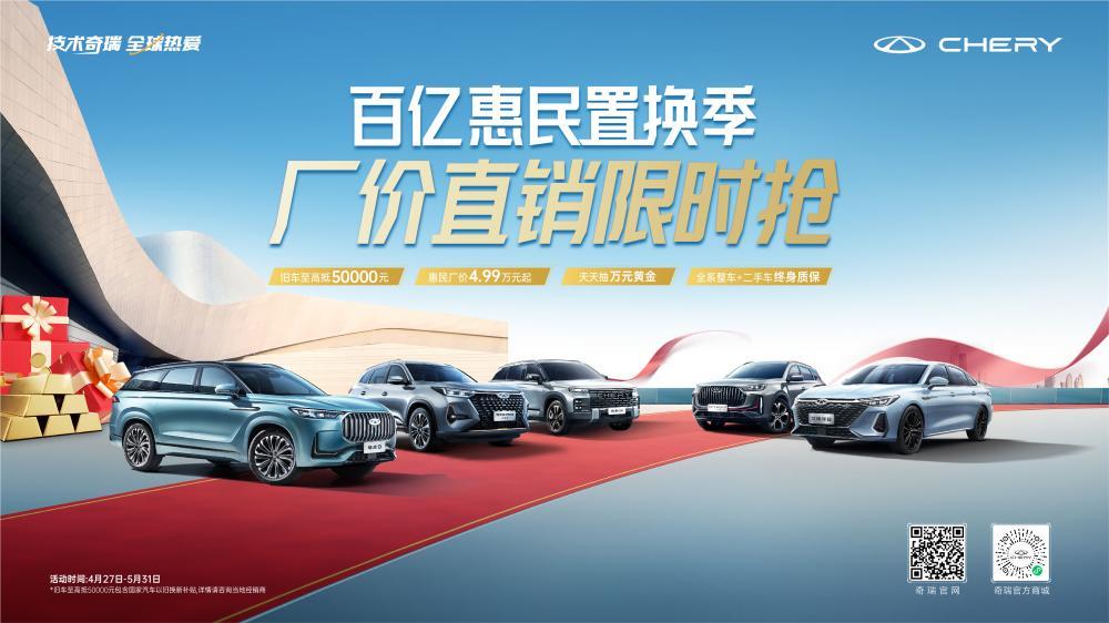 4月27日-5月31日,奇瑞品牌响应国家“以旧换新”补贴政策号召,推出“百亿惠民置换季 厂价直销限时抢”活动,旧车不限车况、不限里程、不限年限,至高可抵5万元,更有每天抽万元黄金以及全系整车 二手车终身质保等多重福利,助力广大消费者购买心仪好车。