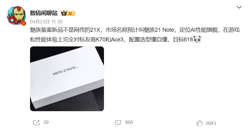 近日,微博博主@数码闲聊站在微博上爆料,称魅族备案新品预计将被命名为魅族21 note,该机定位略低于魅族21/魅族21 pro,在游戏和性能体验上将对标redmi k70和一加ace 3,届时将以「ai性能旗舰」的名头做宣发。