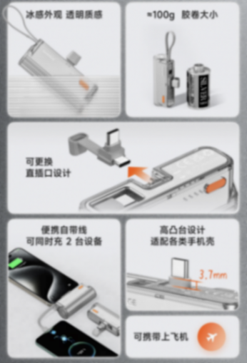 官方介绍称,这款移动电源重量约 100 克,外观采用双注塑工艺,呈现“透明质感”。