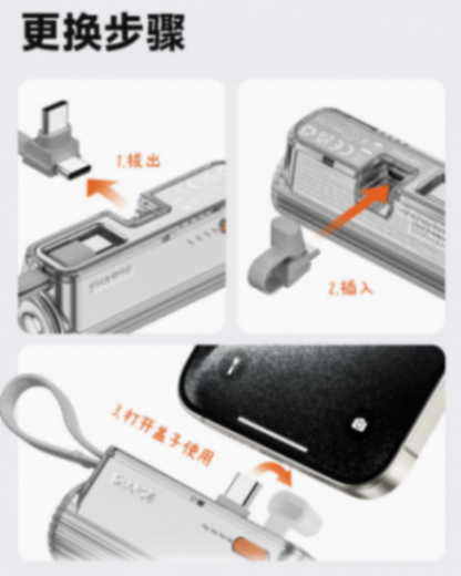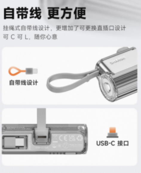 it之家注意到,这款移动电源采用可更换接口设计,顶部 usb-c 接口可更换为 lightning 接口,还额外带有一根 usb-c 线,不用时可以用作挂绳,支持双设备同时充电。