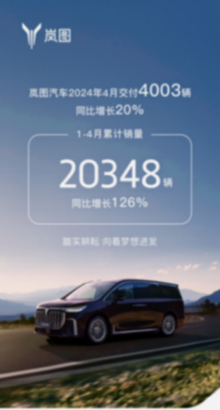 岚图汽车 4 月交付 4003 辆同比增长 20%,1-4 月 20348 辆同比增长 20%