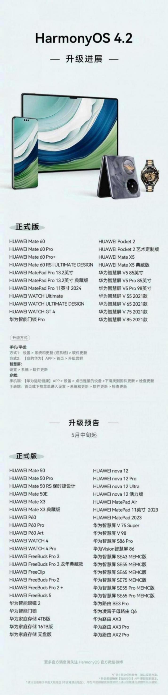嘿,听我说,有个大新闻!没错,华为又来了!这次可不是闹着玩的,华为pocket 2/mate 60系列等11款机型,都可以欢天喜地地升级鸿蒙4.2正式版了!这可是智能手机领域的一大盛事啊!