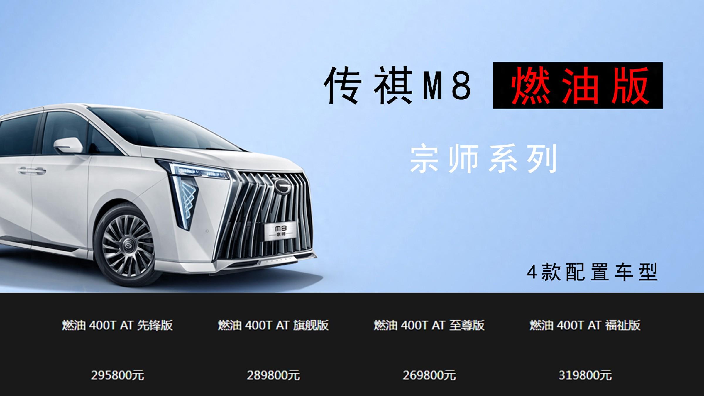 从北京车展的展台上了解,传祺m8 燃油版宗师系列提供了4款不同配置车型,分别为燃油 400t at 先锋版(2024款)、燃油 400t at 旗舰版(2023款)、燃油 400t at 至尊版(2023款)和燃油 400t at 福祉版(2023款),指导价分别为29.58万、28.98万、26.98万和31.98万。接下来,我以燃油 400t at 先锋版(2024款)为例,给大家全方位解读一下它的产品力。