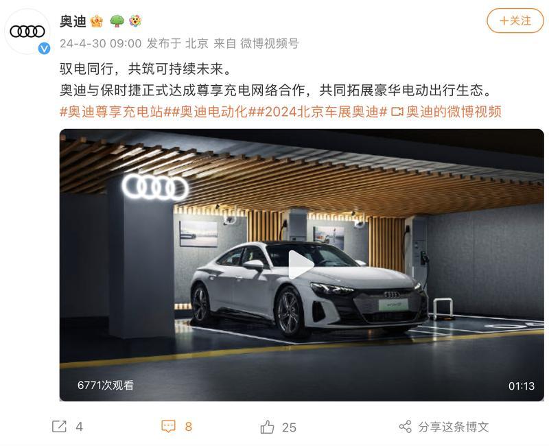 4月30日,奥迪官方宣布与保时捷正式达成充电网络合作,向其用户开放各自品牌充电站。