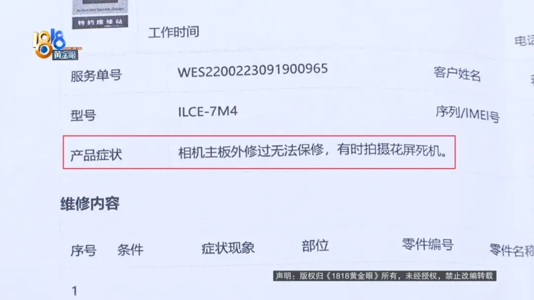蒋女士:用了一年之后呢,又出现了这个卡顿,无法查看相机照片的这个情况。把机身寄过去之后呢,过了几天那个索尼的人告诉我说,他们拆机发现,主板有外修过的痕迹,就是非官方的一个痕迹,就是说我们去外修过。那我就想,我是在质保期内,我的质保有两年,我怎么可能去外修,而且我是第一次发现这个问题,就直接找索尼的官方售后了。然后他就说,我这个主板是外修过的,他们拒保,那我就想这是不是翻新机或者残次机。