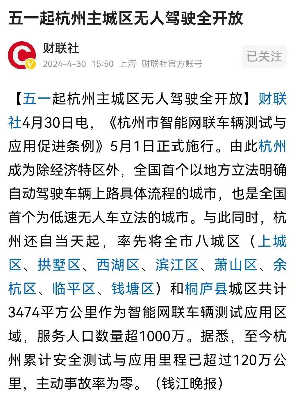 杭州之所以有底气做出这一决定,背后有着坚实的技术支撑。据悉,杭州在无人驾驶领域的测试与应用里程已经超过了120万公里,令人惊讶的是,这期间主动事故率竟然为零。这样的成绩足以证明,杭州在无人驾驶技术方面已经取得了显著的突破和成果。