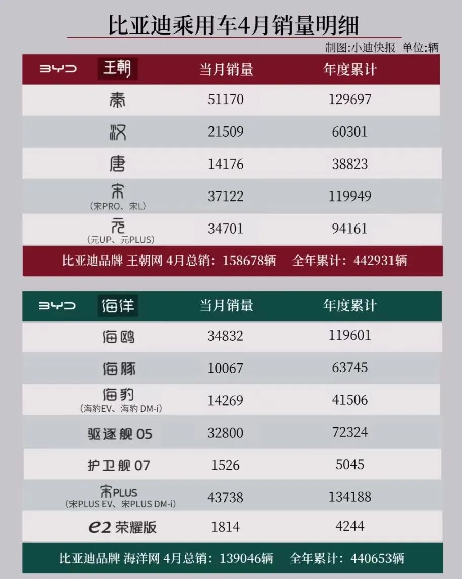 目前,比亚迪汽车已推出包括比亚迪、腾势、方程豹、仰望四大品牌,产品售价上至百万级豪华,下至10万元以下级别,且多款产品在乘用车细分市场霸榜。数据显示,目前王朝网和海洋网是比亚迪主要销量来源,两大产品4月销量分别为15.87万辆和13.90万辆。其中,王朝网中销量最高的车型为秦家族,为5.12万辆,宋、元、汉、唐则分别为3.71万辆、3.47万辆2.15万辆、1.42万辆;海洋网中销量最高的车型为宋plus,为4.37万辆,海鸥和驱逐舰05次之,分别为3.48万辆和3.28万辆,海豹、海豚为1.43万辆和1.01万辆。