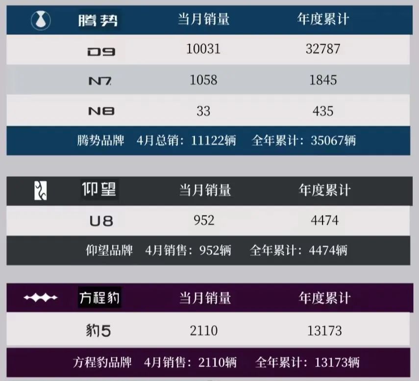 再来看看仰望及方程豹品牌4月的销量表现,4月仰望品牌累计销量为952辆,均来自u8车型。仰望品牌是比亚迪在2022年11月推出的全新高端新能源品牌,该品牌由比亚迪汽车工业有限公司全资控股,瞄准百万级市场。首款车型u8在去年9月上市,定位高端硬派越野suv,售价为109.8万元。