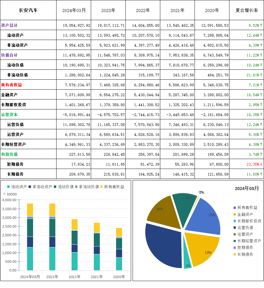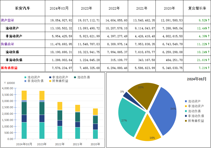 2024年1季度,长安汽车总资产达到19,054,927.92万元,去年19,017,112.71万元,与期初持平;其中流动资产达到13,100,502.32万元,与期初持平,非流动资产达到5,954,425.59万元,比期初提升0.52%。