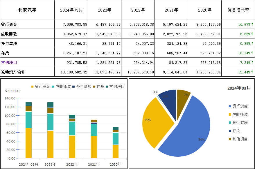 2024年1季度,长安汽车流动资产规模达到13,100,502.32万元,与期初持平。其中货币资金比期初提升8.01%,应收账款比期初降低2.45%,存货比期初降低6.34%。