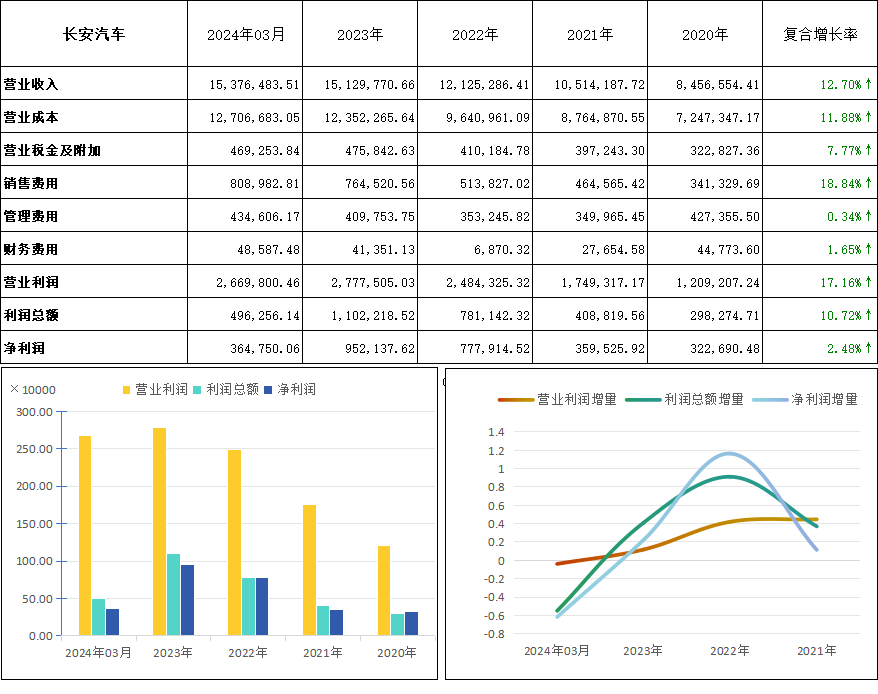 2024年1季度,长安汽车累计实现营业收入15,376,483.51万元,去年实现营业收入15,129,770.66万元,比期初提升1.63%;实现营业利润总额496,256.14万元,比期初降低54.98%;实现净利润364,750.06万元,比期初降低61.69%。