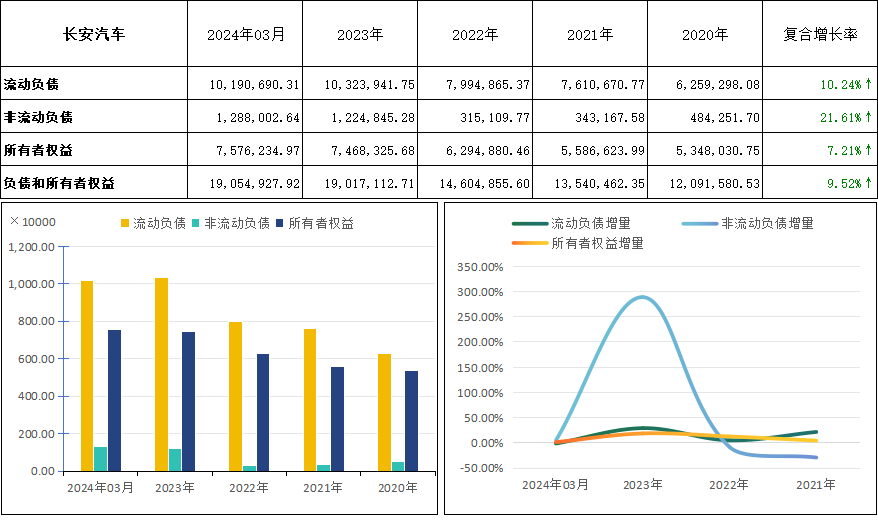 2024年1季度,长安汽车负债和权益总额达到19,054,927.92万元,与期初持平;其中负债达到11,478,692.95万元,比期初降低0.61%,所有者权益7,576,234.97万元,比期初提升1.44%。资产负债率60.24%,比期初降低0.8%,产权比率为1.52,比期初降低2.02%。
