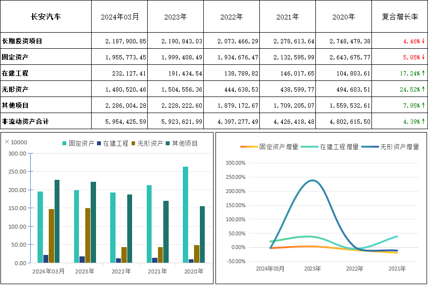 2024年1季度,长安汽车非流动资产达到5,954,425.59万元,比期初提升0.52%。长期投资项目达到2,187,900.85万元,与期初持平;固定资产1,955,773.45万元,比期初降低2.18%;在建工程达到232,127.41万元,比期初提升21.26%;无形资产1,480,520.46万元,比期初降低1.6%;其他项目2,286,004.28万元,比期初提升2.59%。