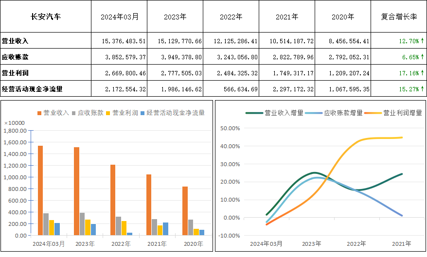 2024年1季度,长安汽车累计营业收入比期初提升1.63%,同时应收账款比期初降低2.45%。