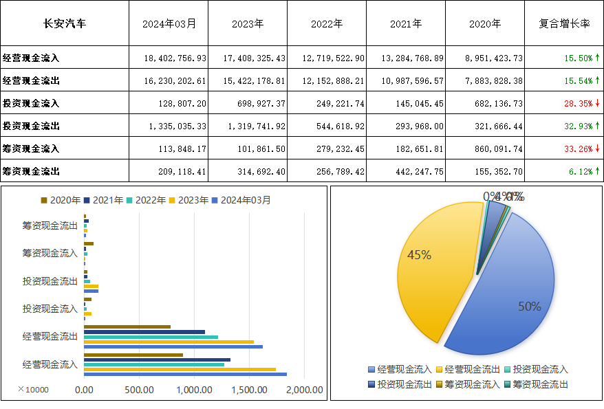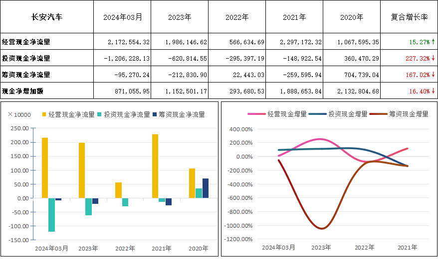 2024年1季度,长安汽车现金及现金等价物871,055.95万元,比期初降低24.42%,其中经营活动现金净额2,172,554.32万元,比期初提升9.39%;投资活动现金净额-1,206,228.13万元,比期初降低94.3%;筹资活动现金净额-95,270.24万元,比期初提升55.24%。