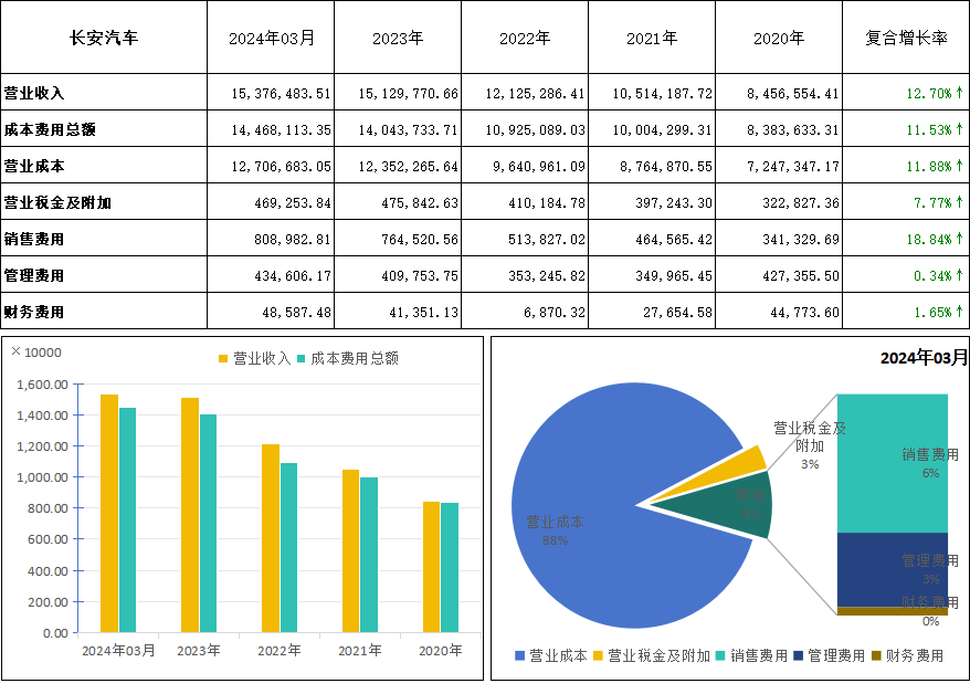 2024年1季度,长安汽车发生成本费用累计14,468,113.35万元,比期初提升3.02%,其中营业成本12,706,683.05万元,占成本费用总额的87.83%;销售费用为808,982.81万元,占成本费用总额的5.59%;管理费用为434,606.17万元,占成本费用总额的3.00%;财务费用为48,587.48万元,占成本费用总额的0.34%。