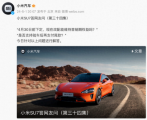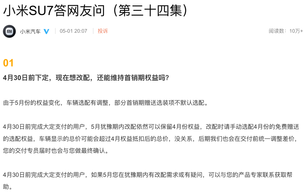 针对“4月30日前下定,现在想改配,还能维持首销期权益吗”的问题,小米汽车回复称,由于5月份的权益变化,车辆选配有调整,部分首销期赠送选装项不默认选配。4月30日前完成大定支付的用户,5月犹豫期内改配依然可以保留4月份权益。另外还解答了车载配件的一些问题,感兴趣的小伙伴可以自行去了解