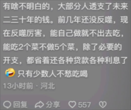 吃归吃以前放开吃,现在是勒紧裤腰带过日子,消费降级并不是开玩笑