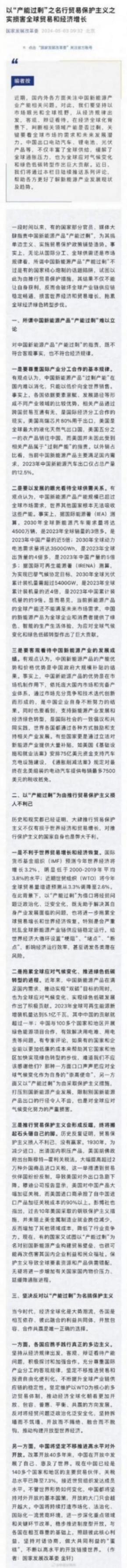 国家发展改革委3日发文称:一段时间以来,有的国家部分官员、媒体大肆指责中国新能源产品“产能过剩”,为其搞单边主义、实施贸易保护政策铺垫造势。事实上,无论从国际分工、全球供需还是市场规律看,所谓中国新能源产品“产能过剩”不过是有的国家精心炮制的话题陷阱,试图以此为由推行贸易保护措施,其结果不仅不能让自身获利,反而会破坏全球产业链供应链稳定畅通,损害世界经济和贸易增长,拖累全球经济绿色转型步伐。